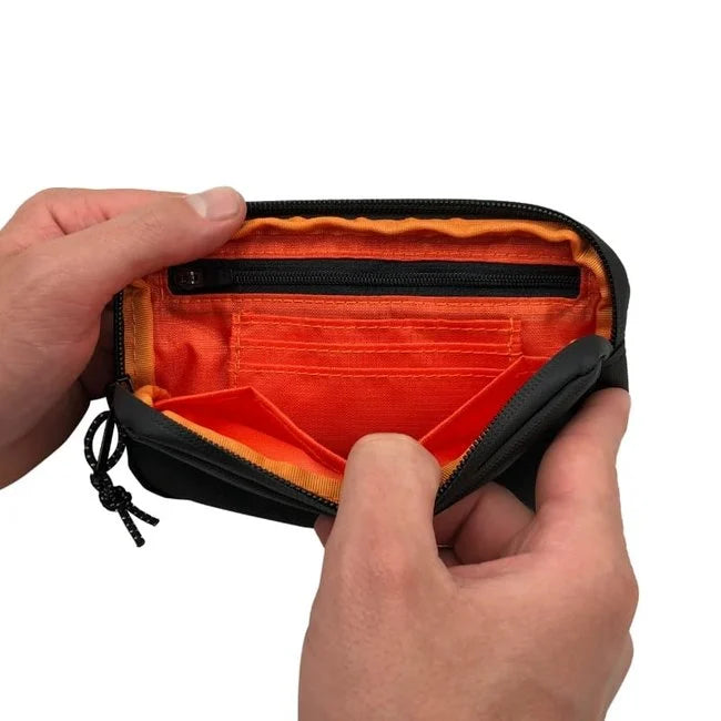 The cycling ride wallet features interior card slots, a zipped pouch, and a phone divider all made out of our tight weave nylon ripstop. All fabrics used balance a luxurious feel and sturdy construction. Fits all iPhone sizes including Plus/Max sizes and comparable device sizes.
