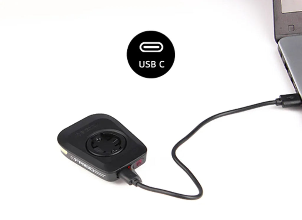 The light is compact and compatible with Garmin/Wahoo computer mounts and works with Garmin/Wahoo/Bryton computers. It is IPX6 heavy rain resistant and designed with a type-c charging port.