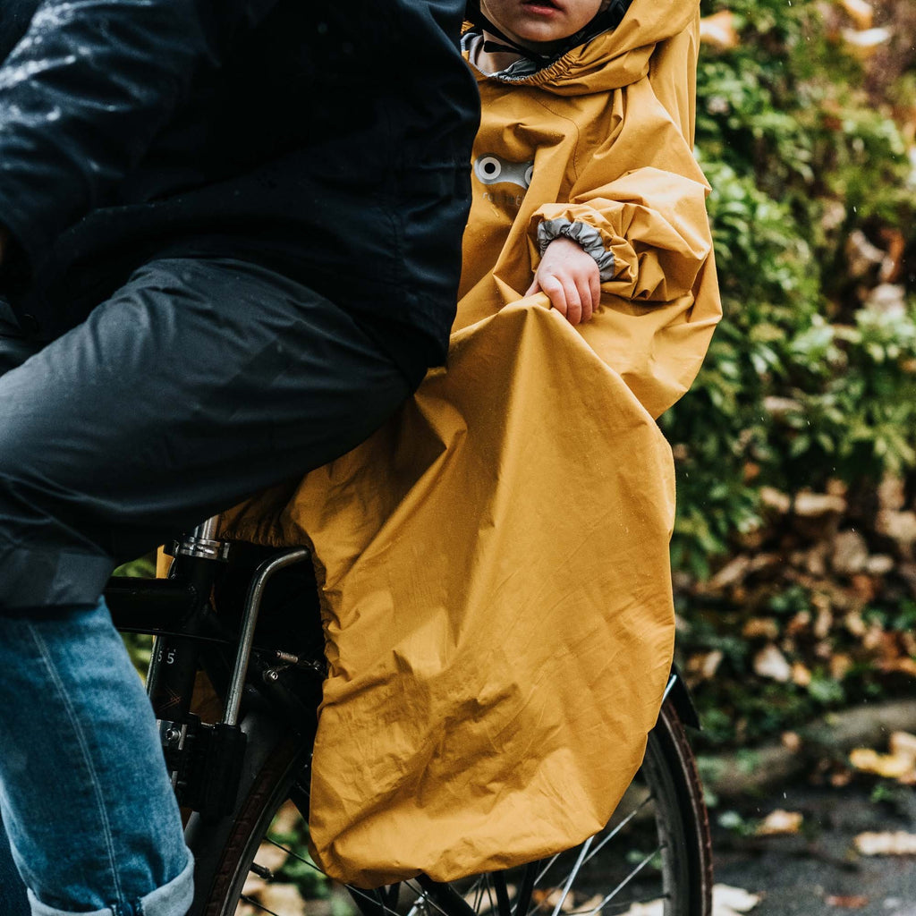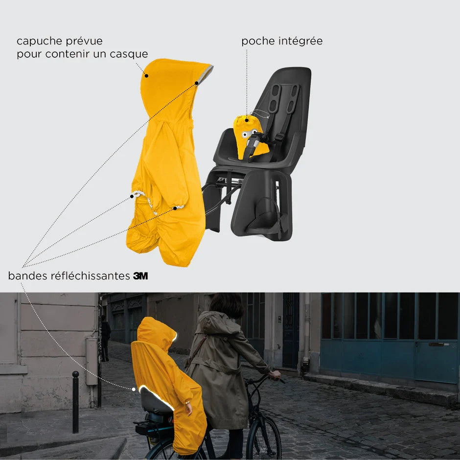 Your raincoat adapts to the baby carrier on your bike, at the front as at the back, with the help of an elastic surrounding the seat.