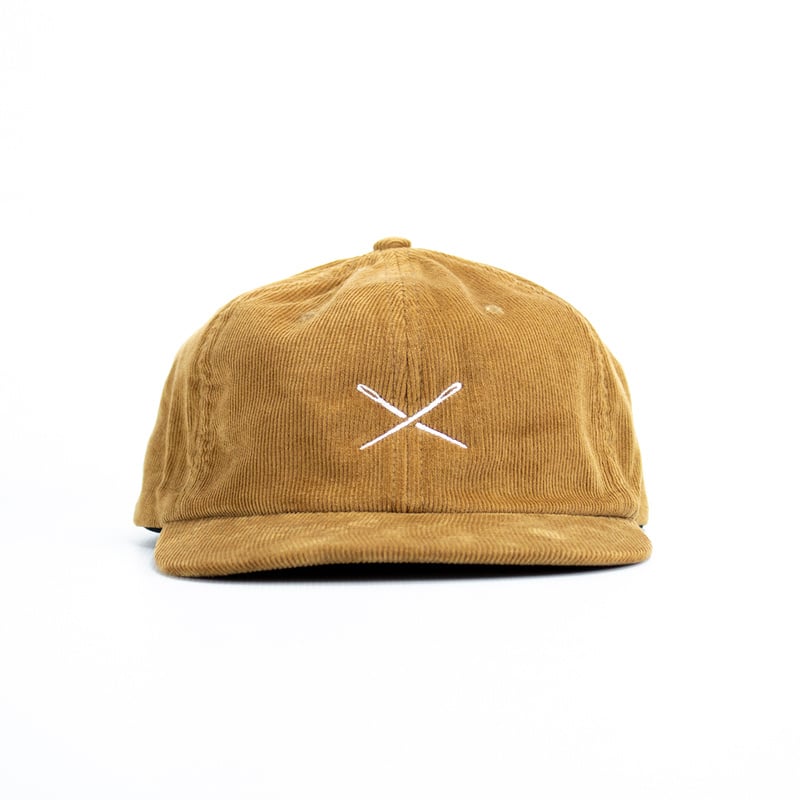 Cotton corduroy six panel cap with a soft unstructured crown, cotton twill sweatband, interior taping and adjustable fabric strap with metal buckle and grommet