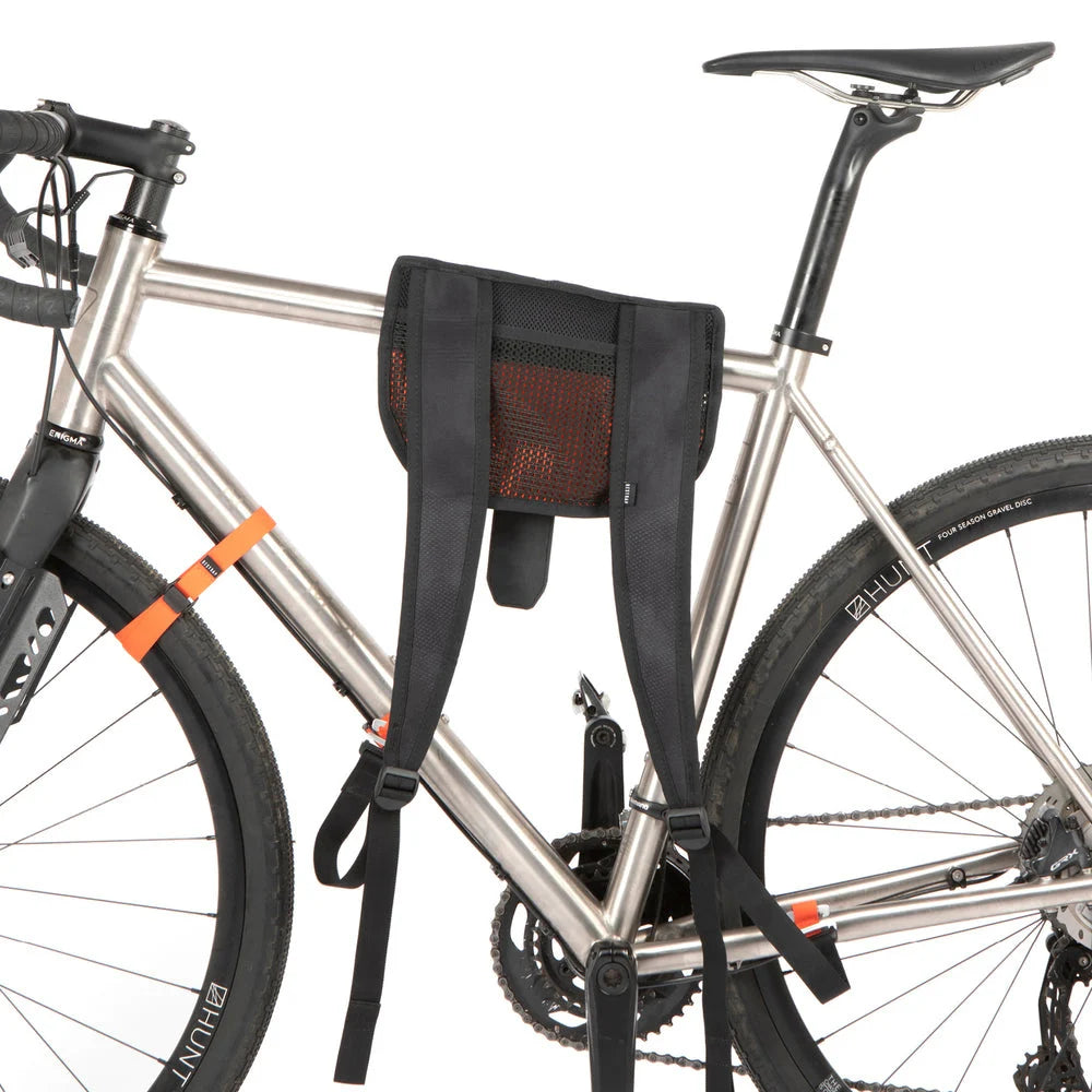 When it's time to walk your bike up tough hike-a-bike terrain, the harness lets you do so hands-free whilst staying well-balanced. Designed to not interfere with your riding, the adjustable mounting points and lightweight design allows you to tailor the harness to fit your bike. Included are two retention straps and a long fast strap to secure the front wheel in place.